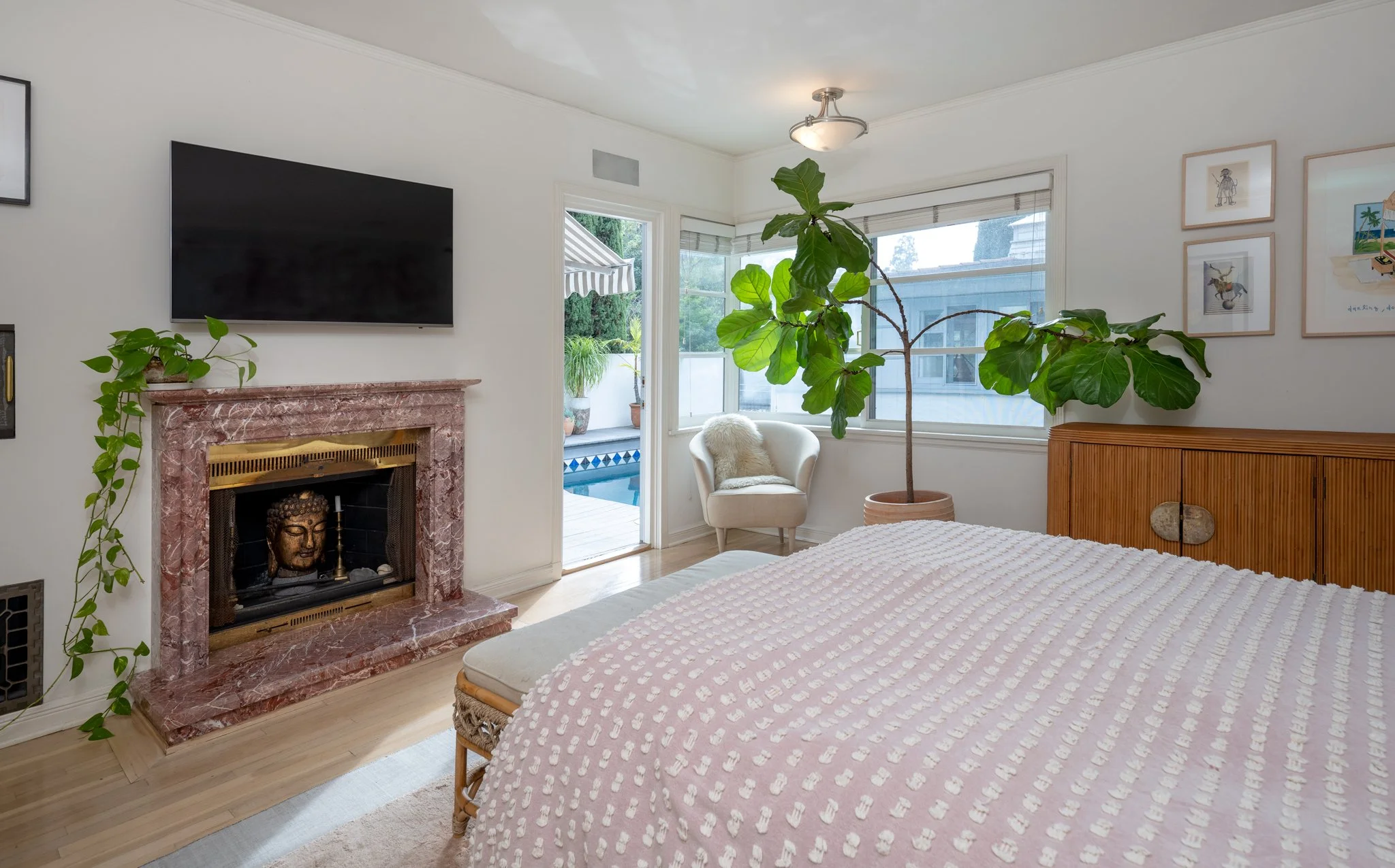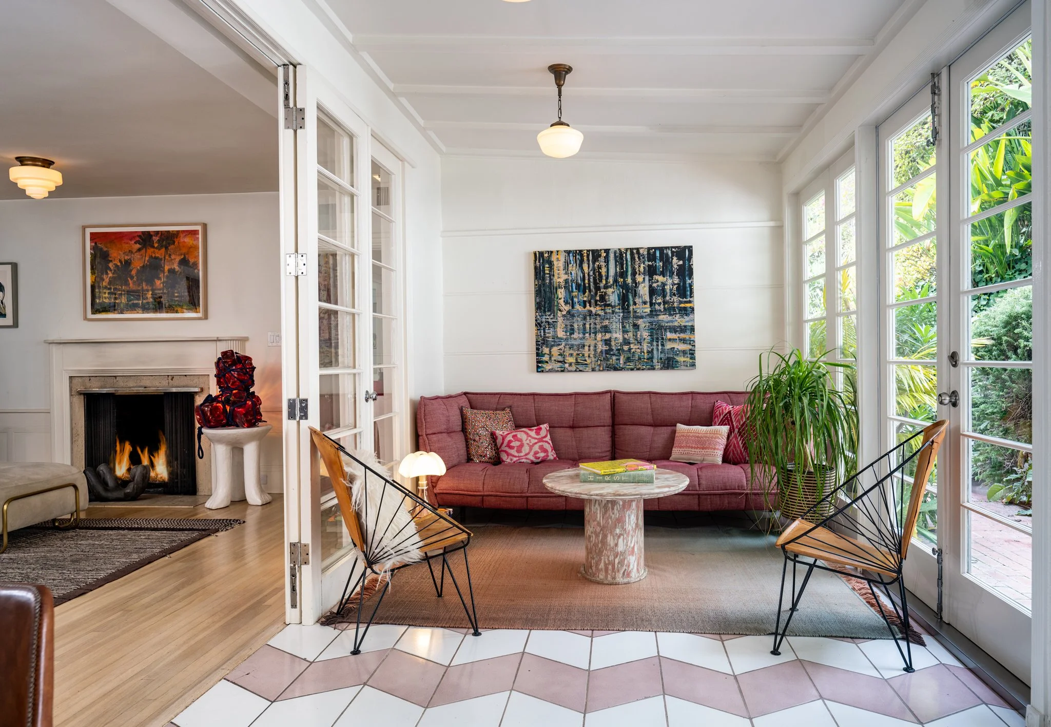 Inside, a sun-filled living room anchored by a classic period fireplace sets an inviting, sophisticated, and timeless tone. The main house flows with an easy dialogue between comfort and entertaining: the chef’s kitchen opens to a formal dining room and an airy solarium with French doors extending directly to the pool terrace. Architectural details recall the neighborhood’s Old Hollywood heritage, with modern upgrades—including an integrated sound system and a whole-house Oxygen Ozone filtration system.