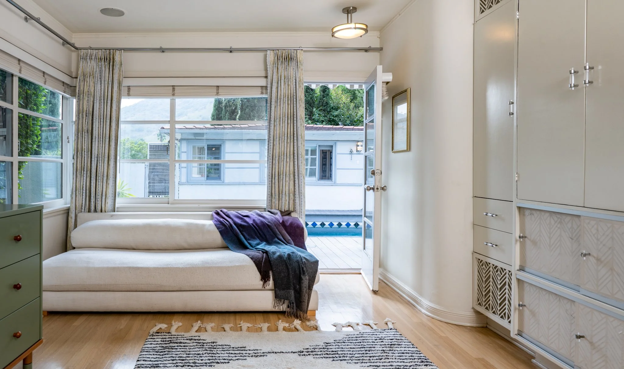 The separate Piet Mondrian–inspired studio guest suite offers a bathroom and kitchenette—ideal for guests, creative pursuits, or a private office removed from the main residence. Additional amenities include three independent temperature zones, two-car garage, site-specific sculptures, and proximity to the Sunset Strip and Runyon Canyon, along with the architectural charm that defines this iconic neighborhood.